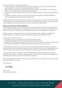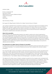 On behalf of the arts and culture sector in Lancashire, we have sent a letter to the Rt Hon Lisa Nandy, Secretary of State for Culture, Media and Sport, calling for urgent support and resources for Preston City Council to secure the future of a major cultural venue, whether through the redevelopment of the historic Guild Hall or the creation of a new, fit-for-purpose facility.